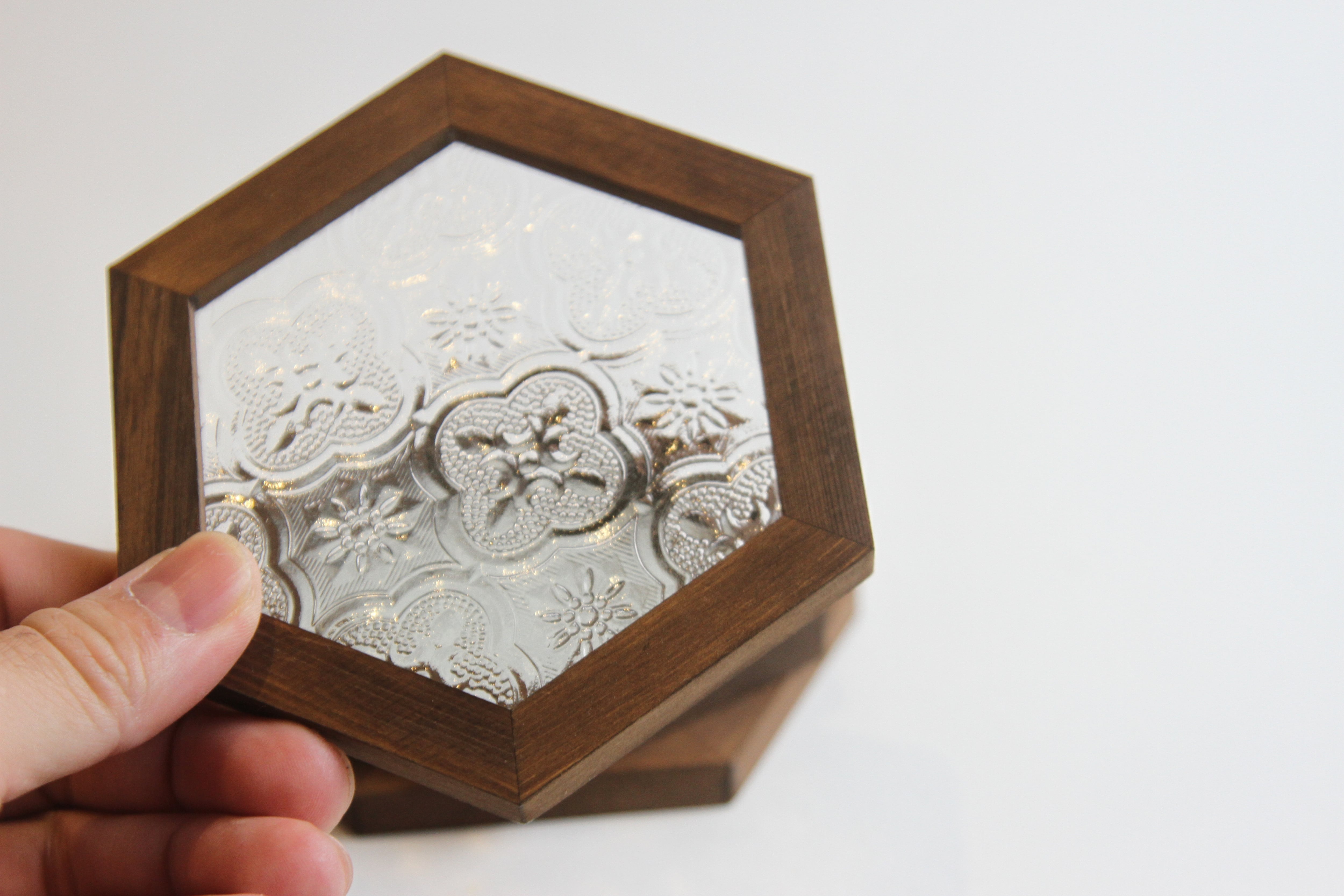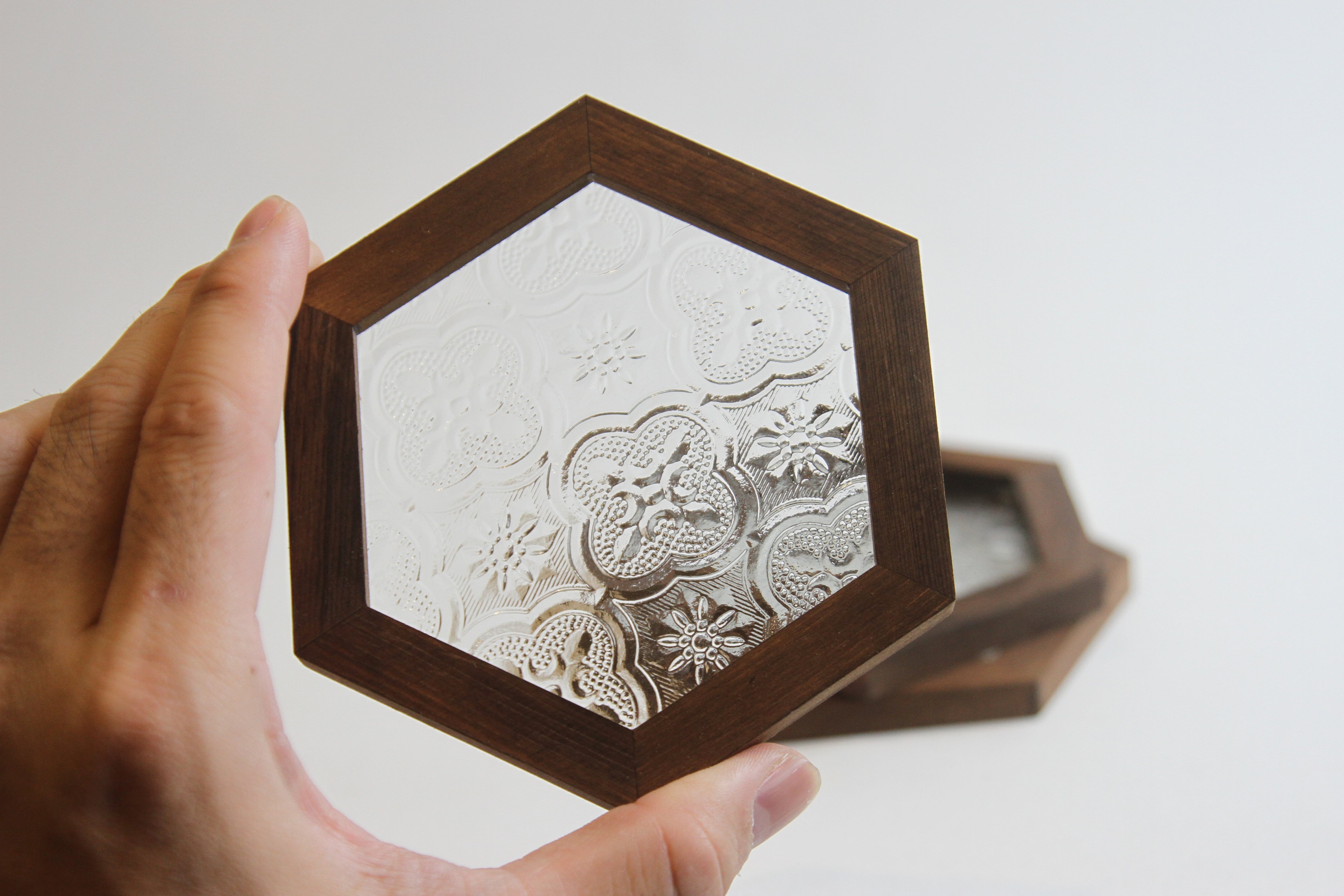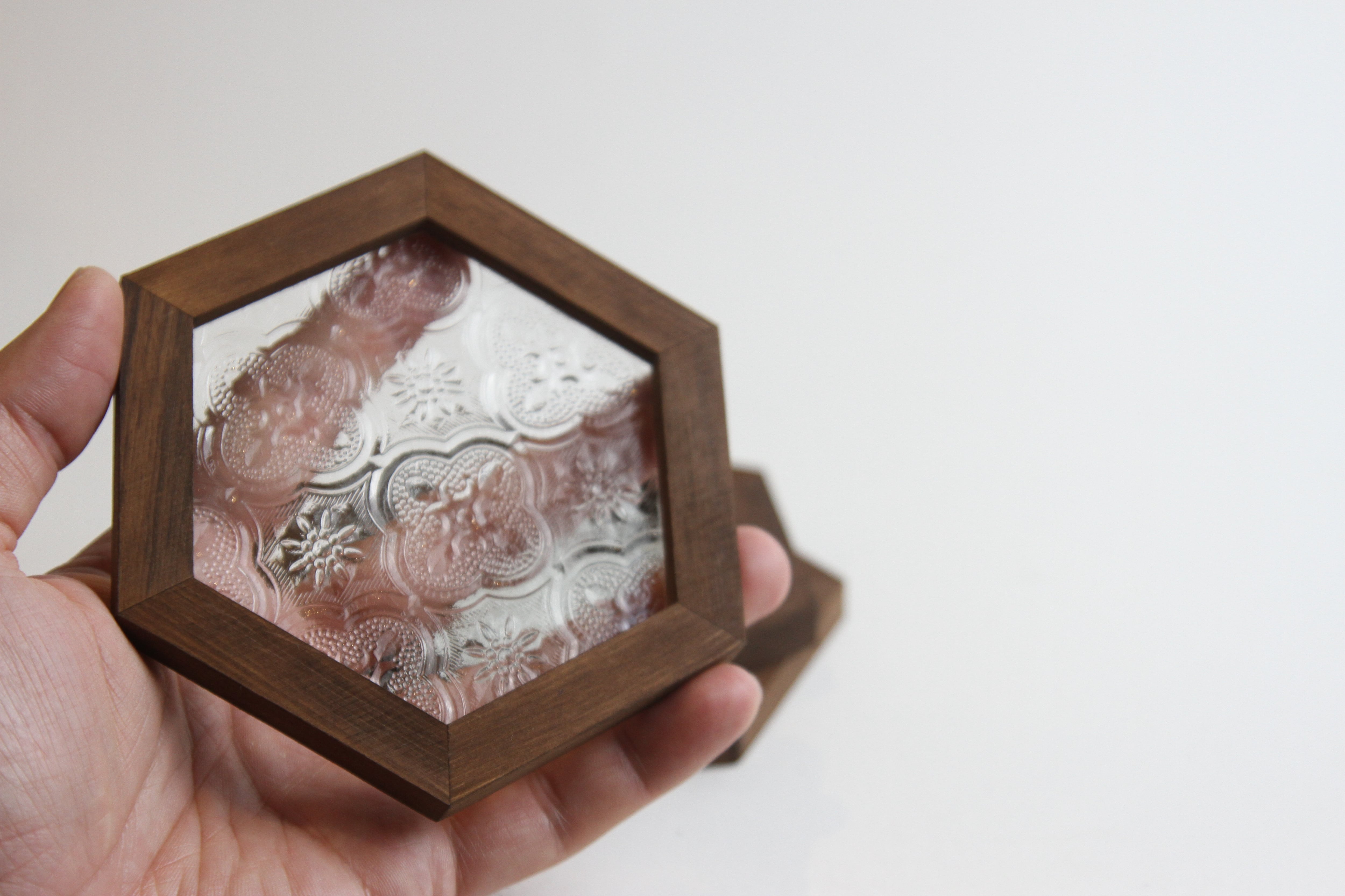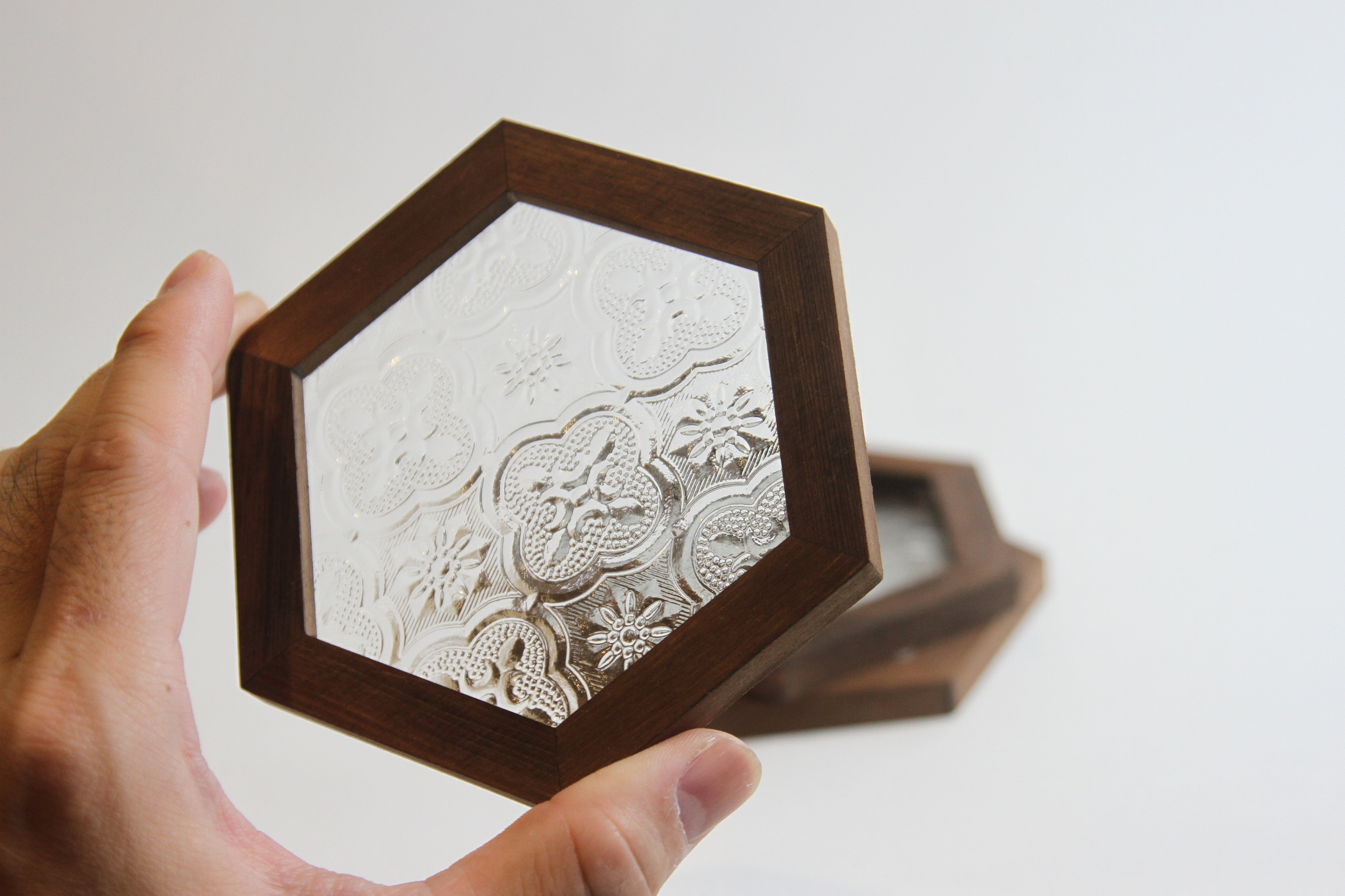台湾職人手作り・ロッカクガタカイドウ(六角型海棠)木枠ガラスコースター