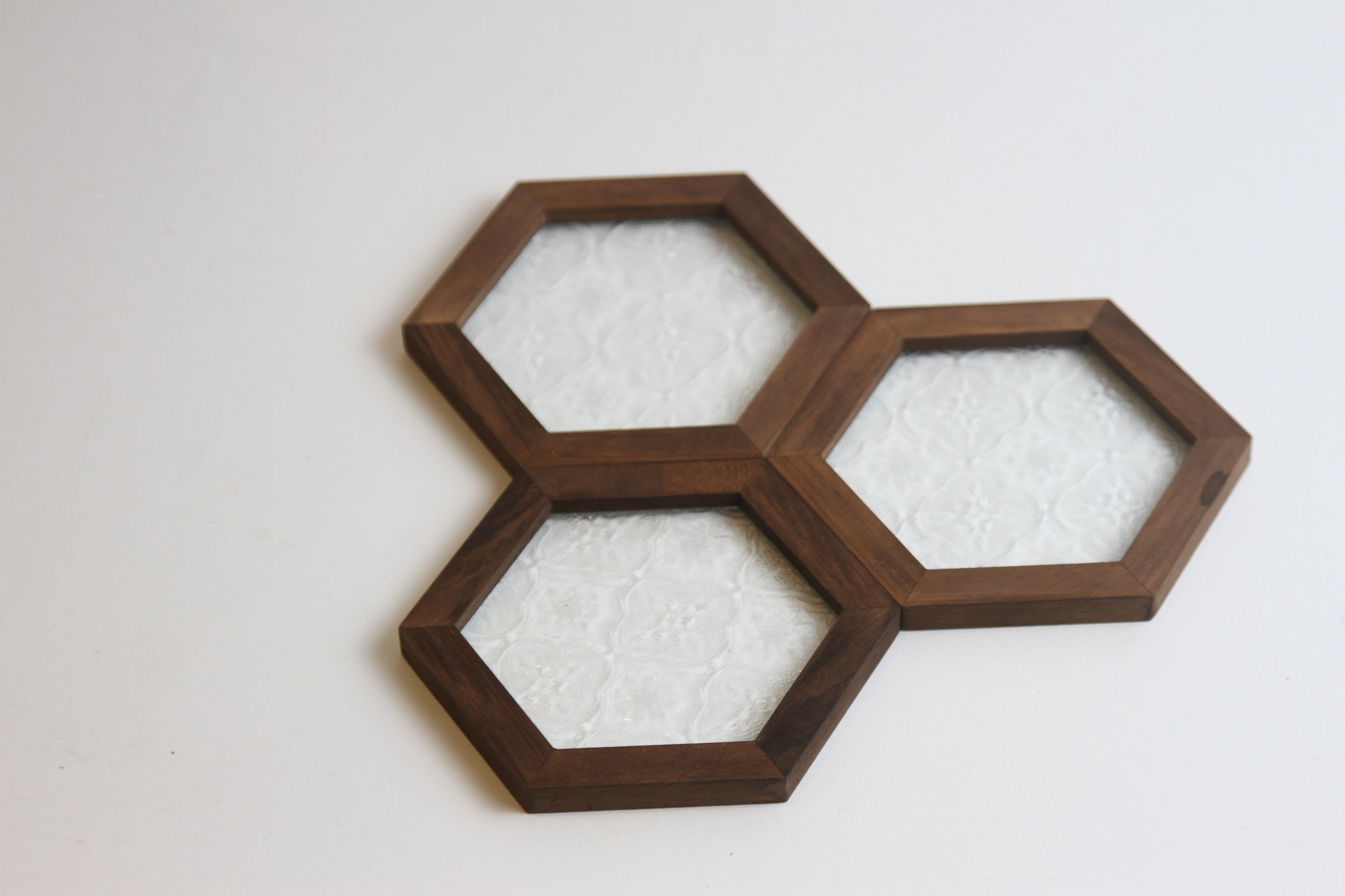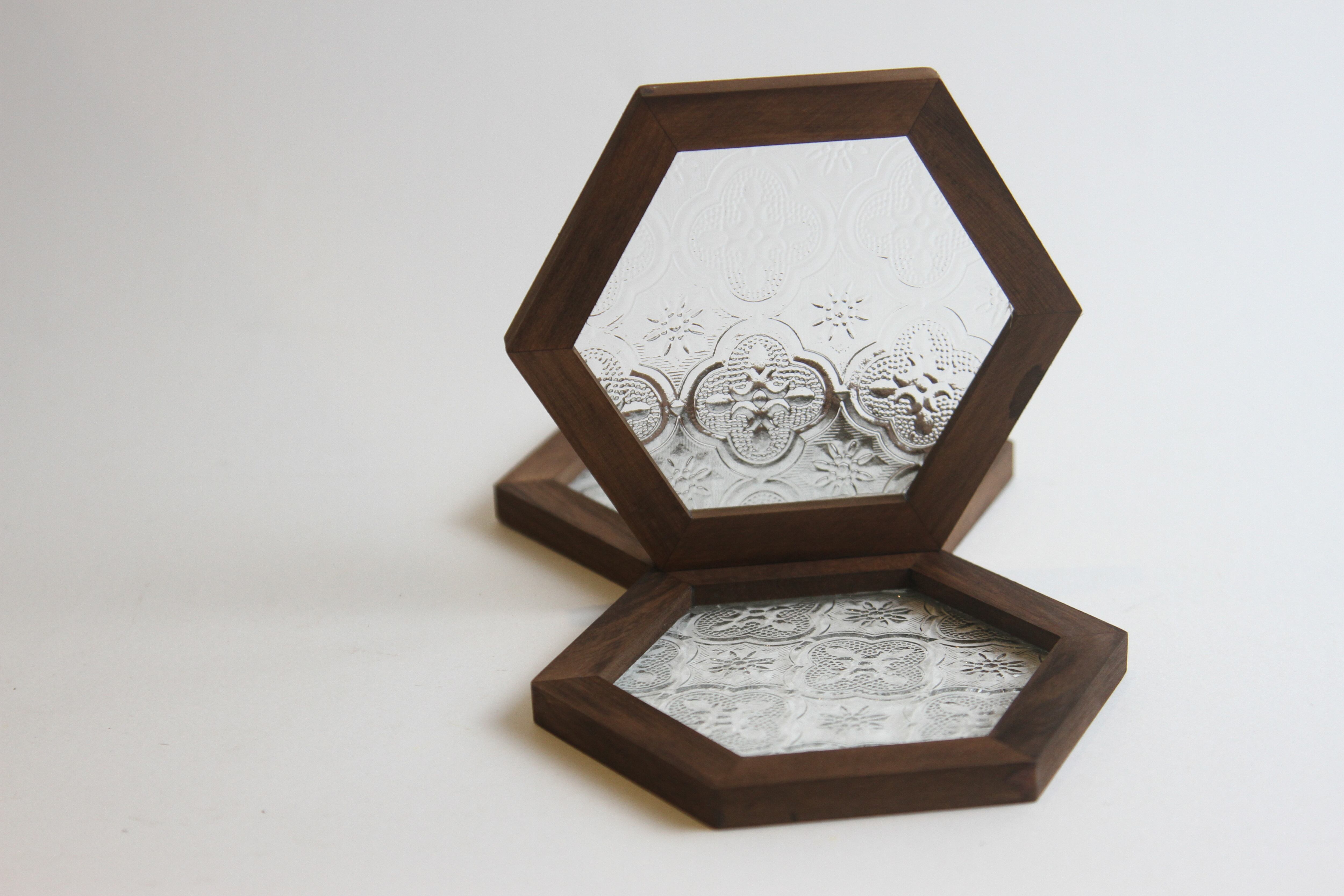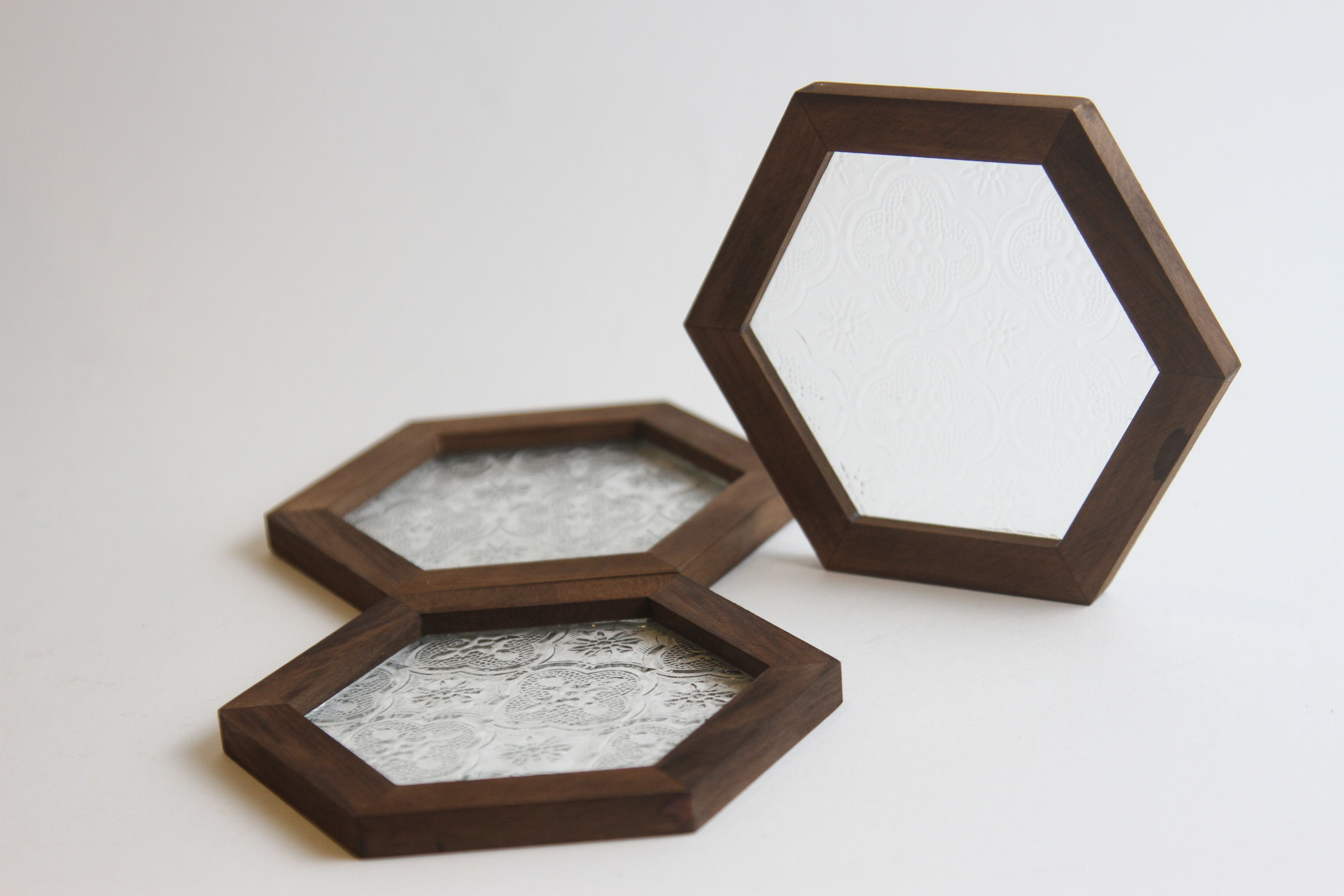 台湾職人手作り・ロッカクガタカイドウ(六角型海棠)木枠ガラスコースター