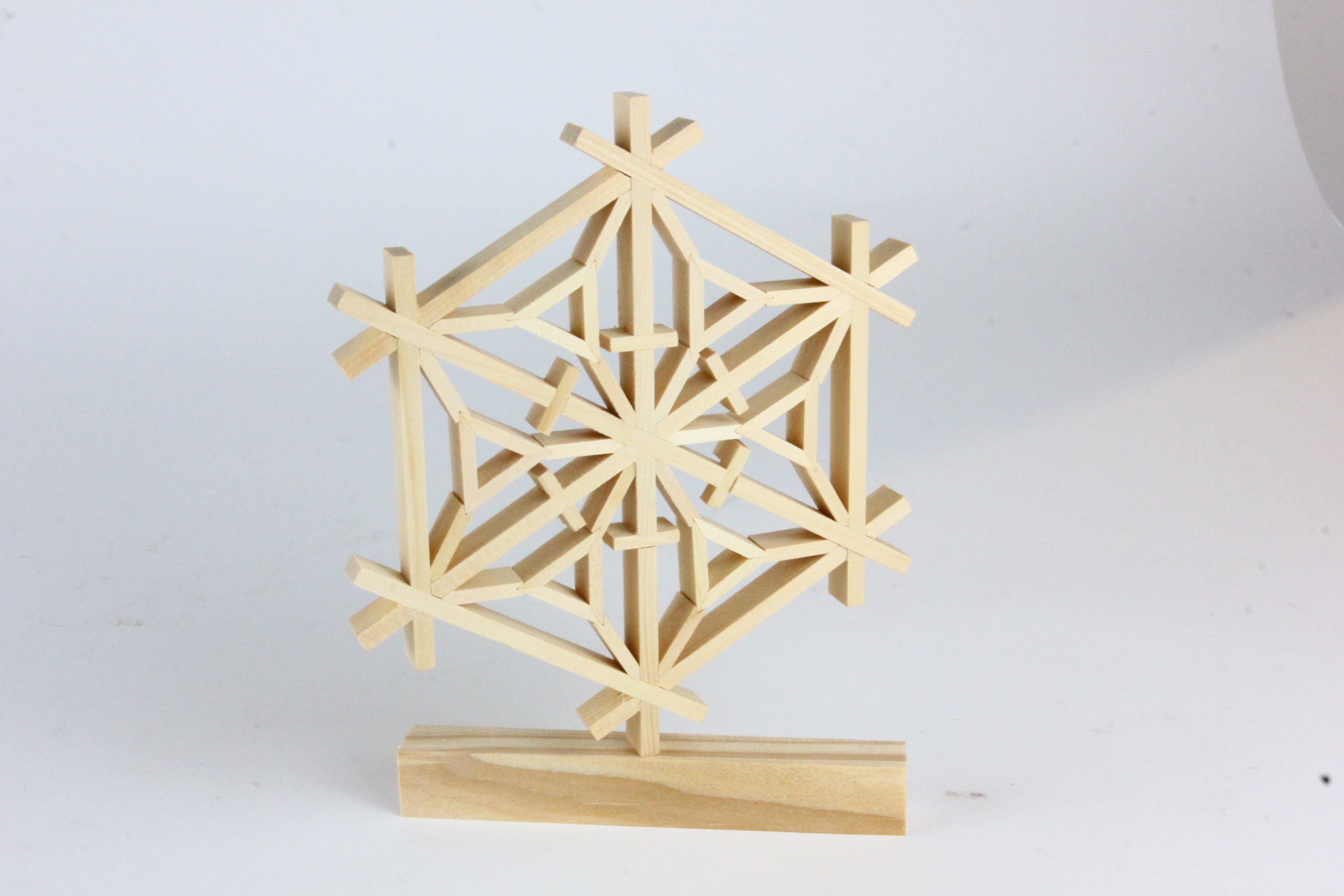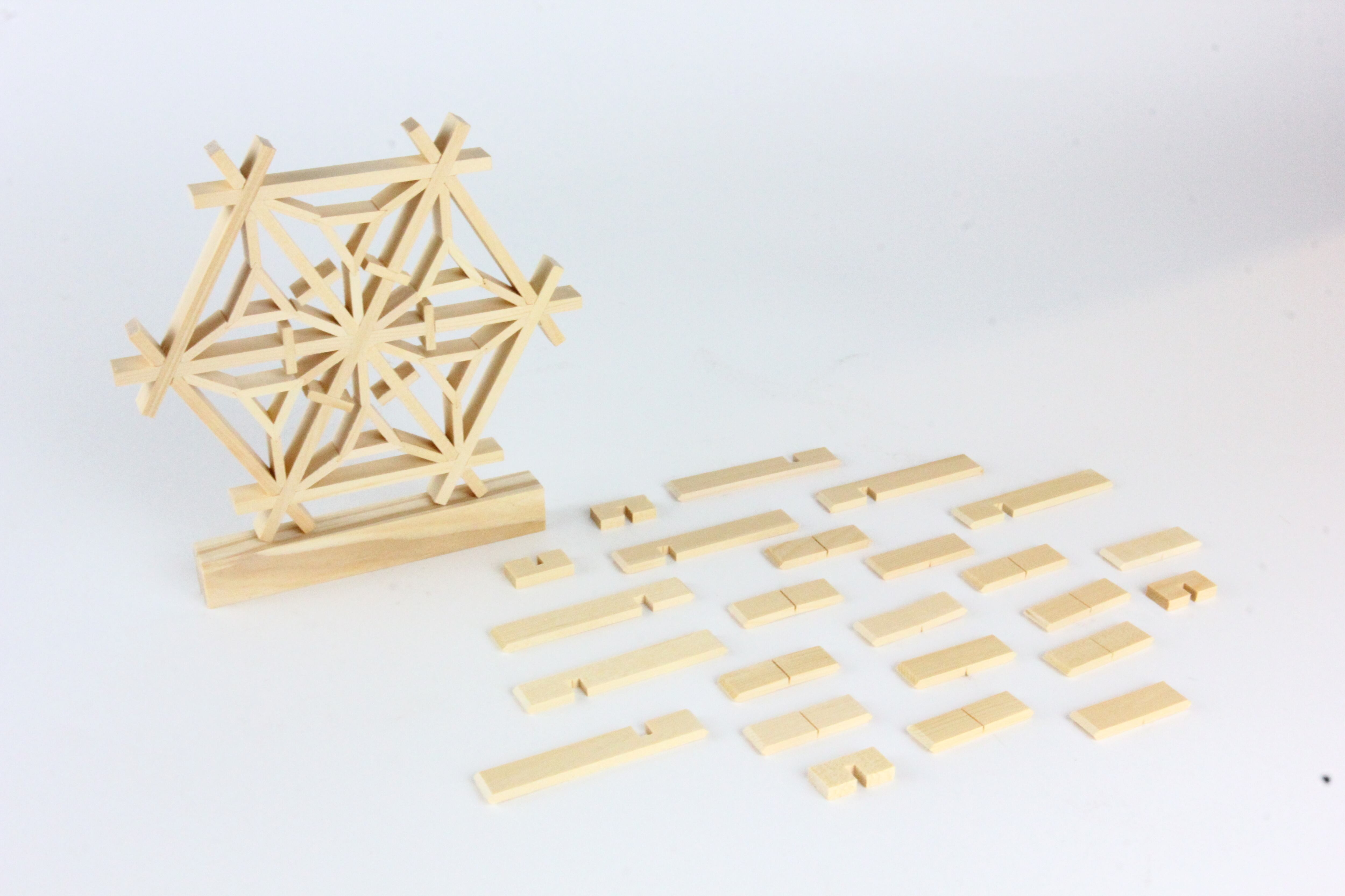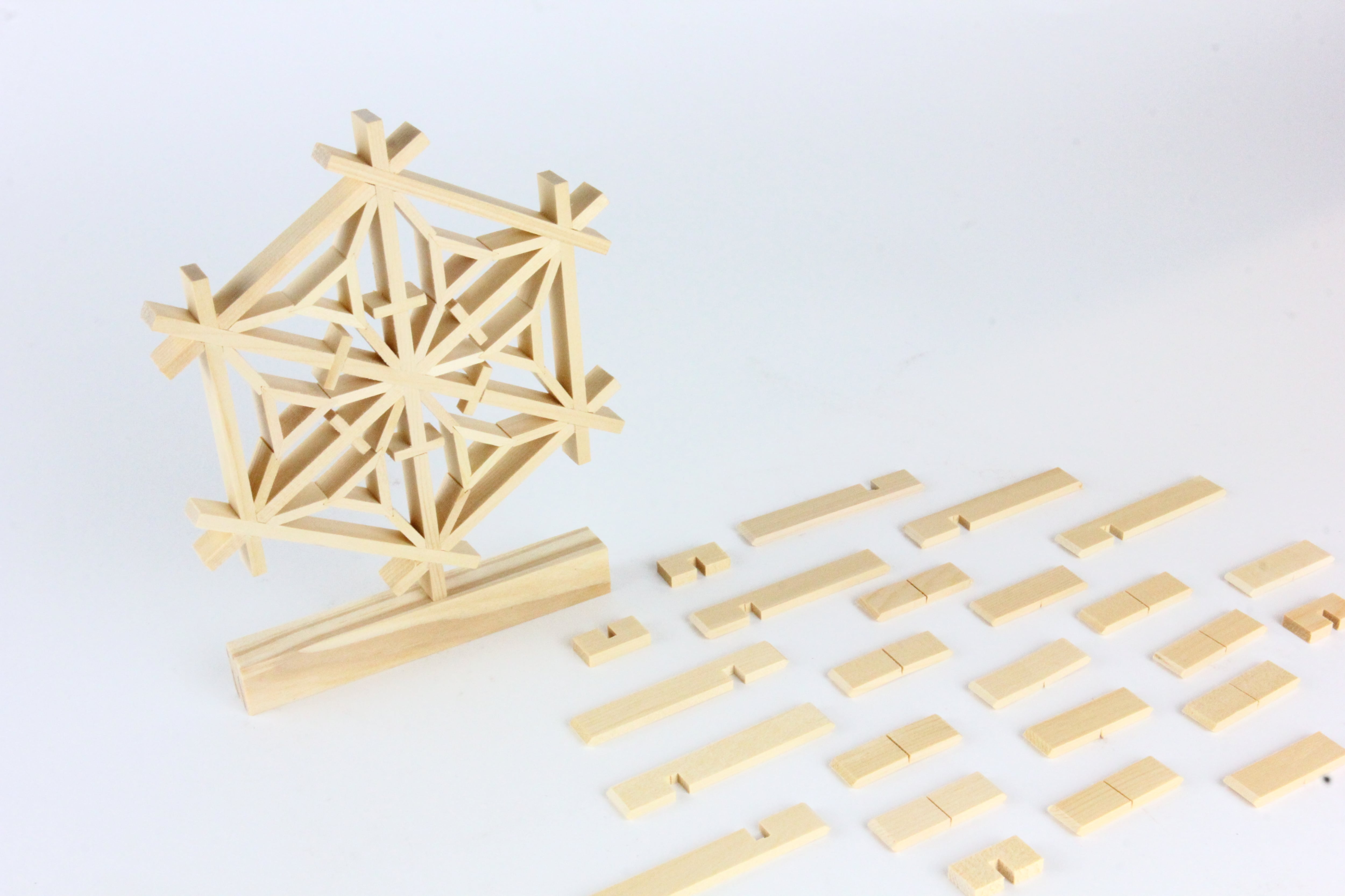 溝や穴を利用して一つ一つのパーツを精巧に組み合わせ、接着剤も使用せずに仕上げます。